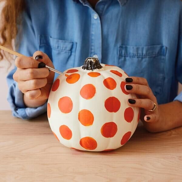 2. Polka Dot Pumpkins Dip the eraser end of a pencil into acrylic paint and stamp dots in rows or random clusters. Gold dots on a white pumpkin is a perennial crowd-pleaser. Metallic dots on matte black is sleek.
